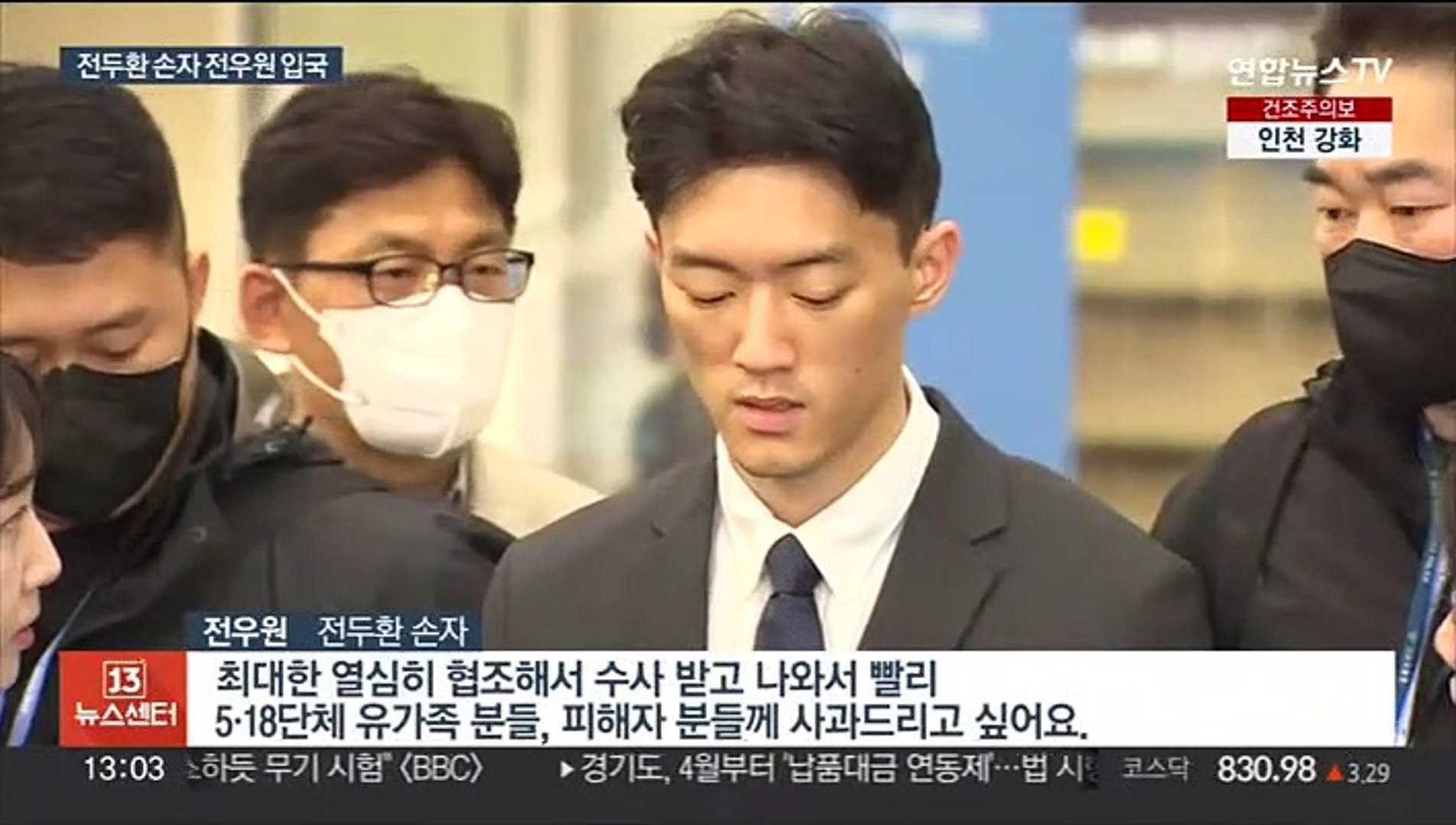 영종도연합뉴스 이지은 기자 전두환 전 대통령 일가에 대한 폭로성 발언을 해온 손자 전우원 씨가 28일 오전 인천국제공항으로 입국.